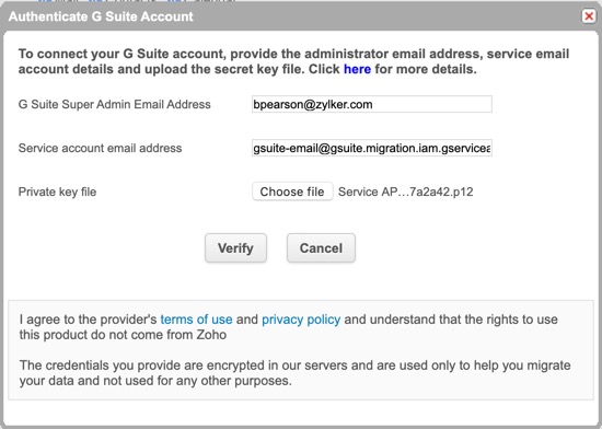 - Una vez realizada la autenticación, ingrese la dirección de correo electrónico del superadministrador de G Suite y la dirección de correo electrónico de la cuenta de servicio en los campos respectivos. Cargue el archivo que se descargó en su sistema en el campo del archivo de clave de producto y haga clic en Verificar .