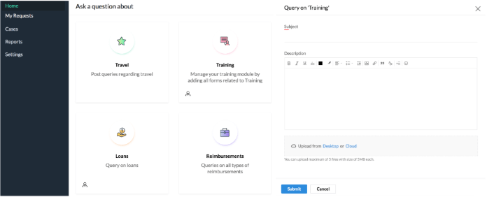 La funcionalidad casos, permite una interacción más eficiente y fluida entre compañeros y superiores a la hora de resolver dudas. Con Zoho People pueden gestionarse y ordenarse fácilmente las consultas, evitando reiteraciones y mails cruzados, entre otros.
