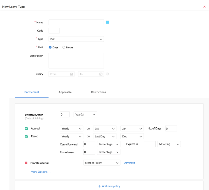 Zoho People logra un alto grado de flexibilidad y personalización en este sentido, pudiendo configurar opciones avanzadas como prorrateos, cobros, pagos, etc. Incluso es posible añadir restricciones o aplicaciones para los fines de semana o la duración de tiempo libre.